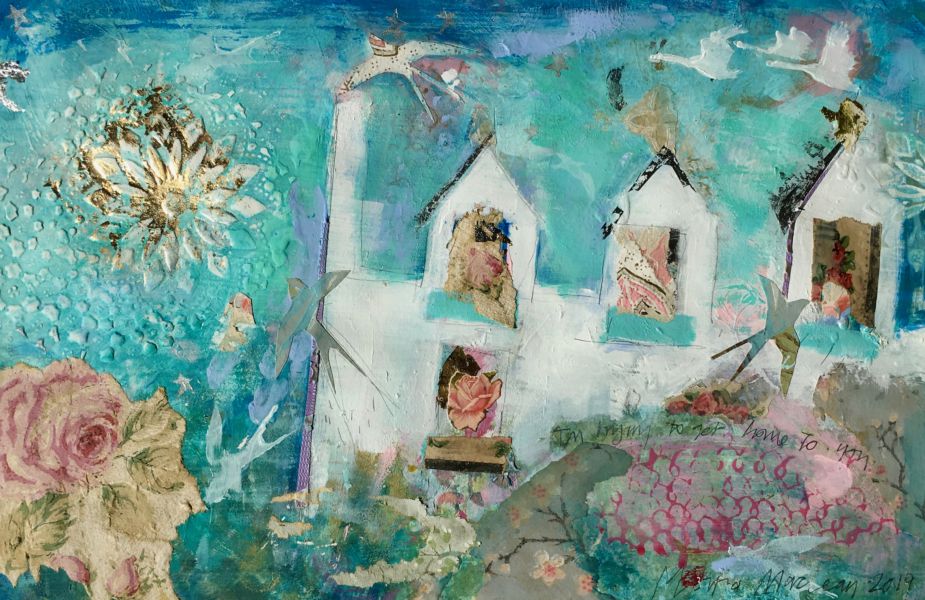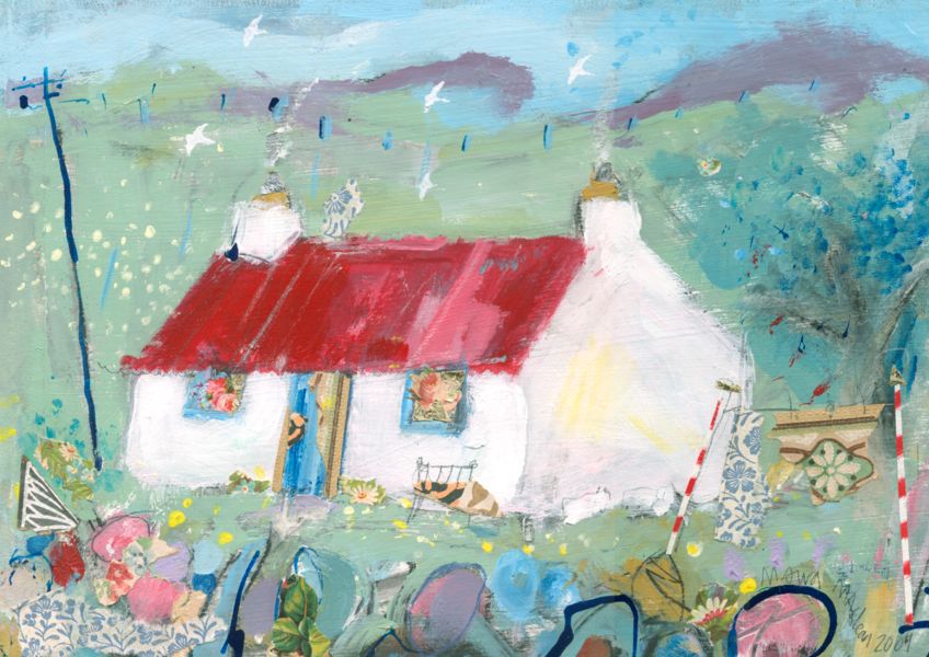 Moira Maclean BA Hons MFA is born, bred, lives and works on the Isle of Lewis. "My paintings are the result of deep-mining memory, trying to recapture the feeling of walking through a snowy village in childhood or looking out over glittering sand and sea or catching glimpses of flowery picnic paraphernalia and glinting caravans. Shelter, whether croft houses, sheilings or caravans , is integral to my paintings. Signs of life and lifestyle, paint and vintage wallpaper, tangible evidences of real lives and generations rescued from abandoned houses, are reborn and re-presented in my paintings. A new life is made from forgotten remnants - a glimmer of life and light through a window, a flicker, a memory"