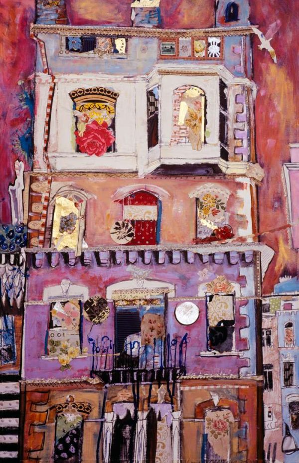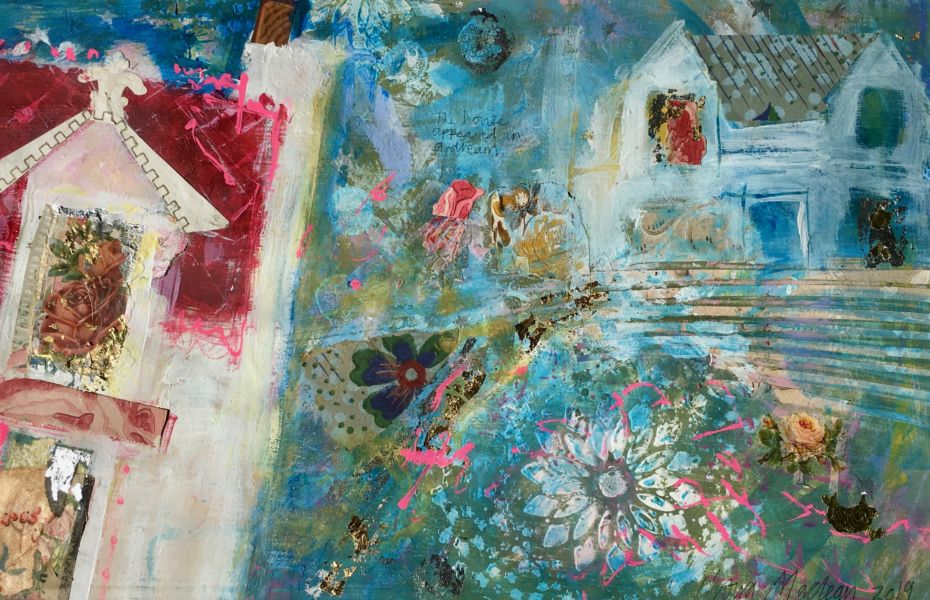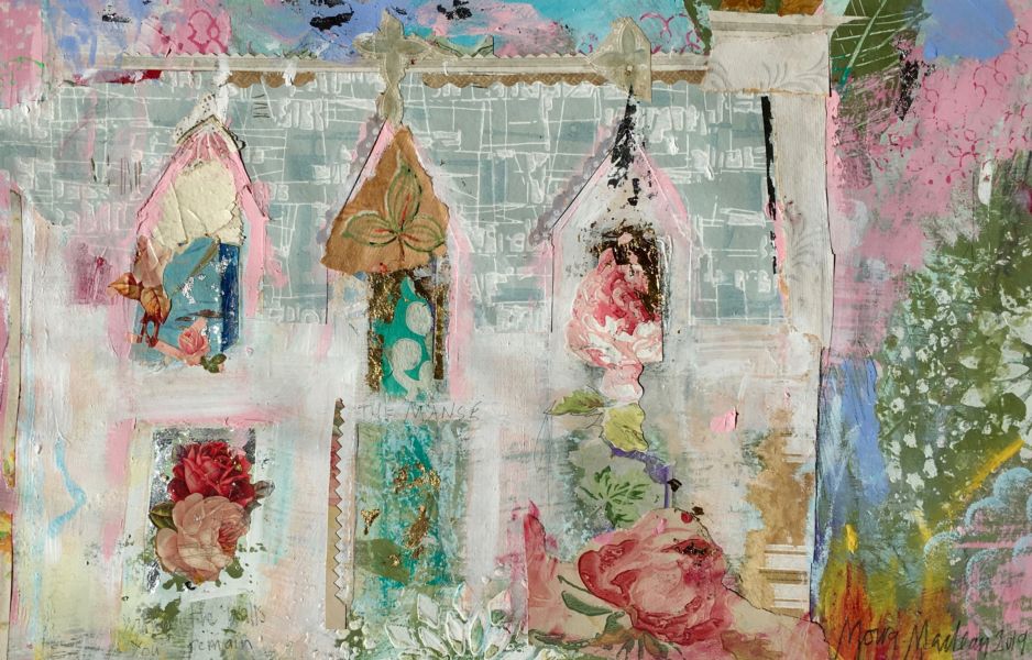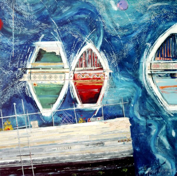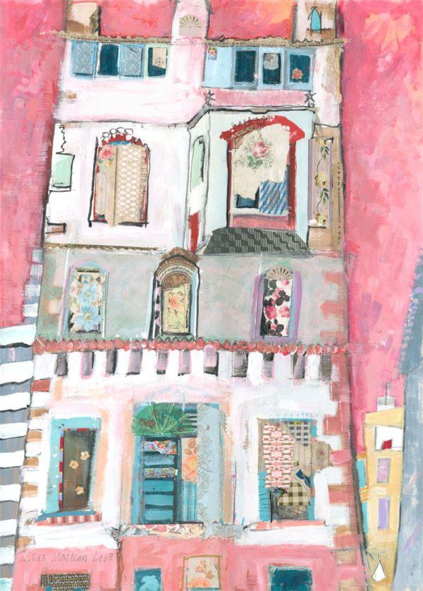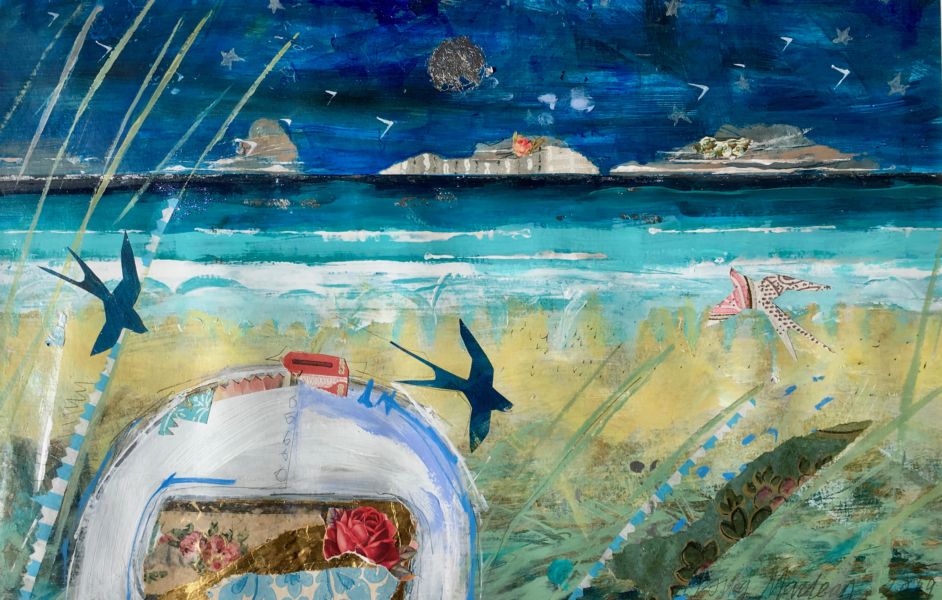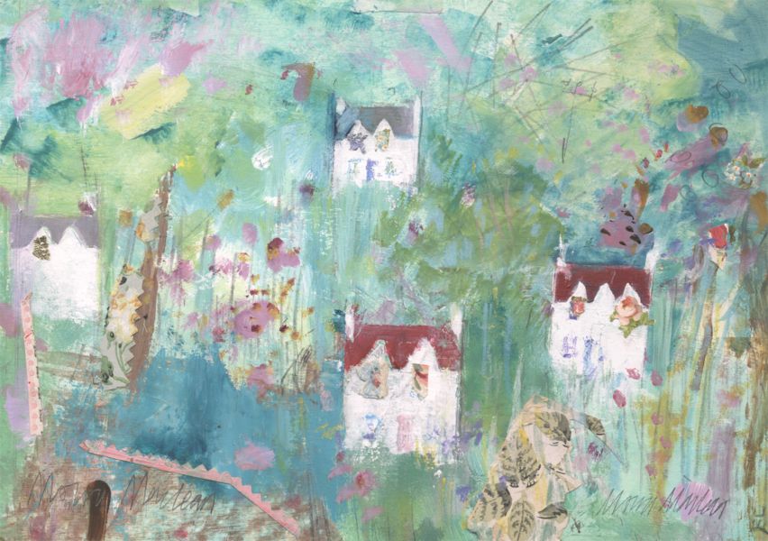 Moira Maclean BA Hons MFA is born, bred, lives and works on the Isle of Lewis. "My paintings are the result of deep-mining memory, trying to recapture the feeling of walking through a snowy village in childhood or looking out over glittering sand and sea or catching glimpses of flowery picnic paraphernalia and glinting caravans. Shelter, whether croft houses, sheilings or caravans , is integral to my paintings. Signs of life and lifestyle, paint and vintage wallpaper, tangible evidences of real lives and generations rescued from abandoned houses, are reborn and re-presented in my paintings. A new life is made from forgotten remnants - a glimmer of life and light through a window, a flicker, a memory"